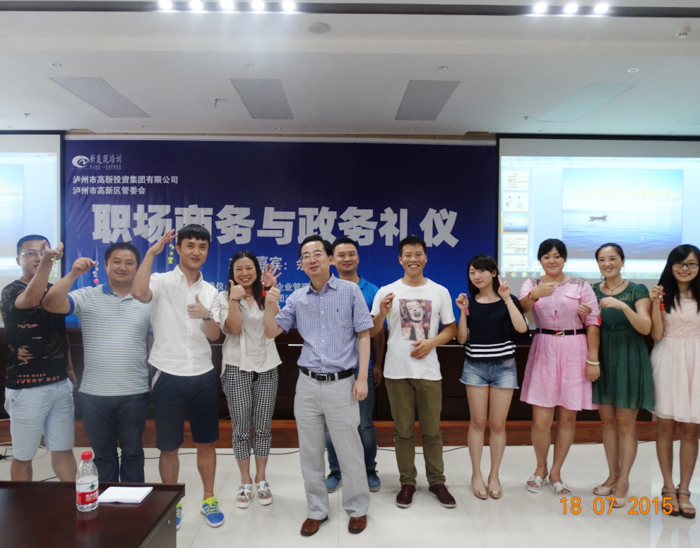 在禮儀培訓中的游戲環(huán)節(jié)第8組成員獲獎由公司馬董事長頒發(fā)獎品